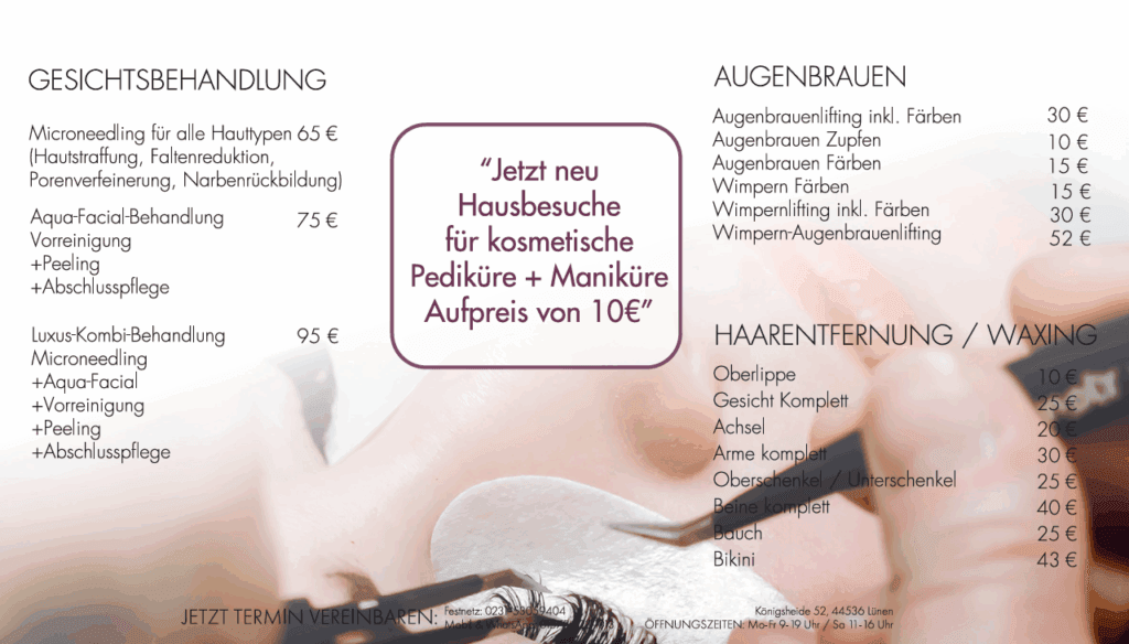 Augenbrauen- und Wimpernpflege: Ihre Augenbrauen und Wimpern sind wichtige Details Ihres Gesichts. Unsere Experten bei Güls Beauty helfen Ihnen mit Dienstleistungen wie Augenbrauendesign und Wimpernverlängerung, ein gepflegtes und attraktives Aussehen zu erzielen.